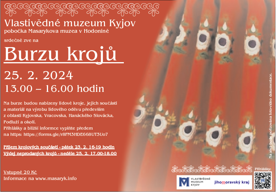 25. 2. 2024 Vlastivědné muzeum Kyjov 13:00-16:00 Příjem krojových součástí - pátek 23. 2. 2024 16-19 hodin Výdej neprodaných krojů - neděle 25. 2. 2024 17-18 hodin