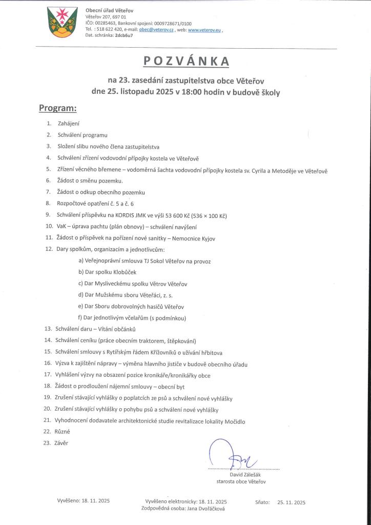 Obec Věteřov zve občany na 23. zasedání zastupitelstva, které se uskuteční v úterý 25. listopadu 2025 v 18:00 hodin v budově školy.