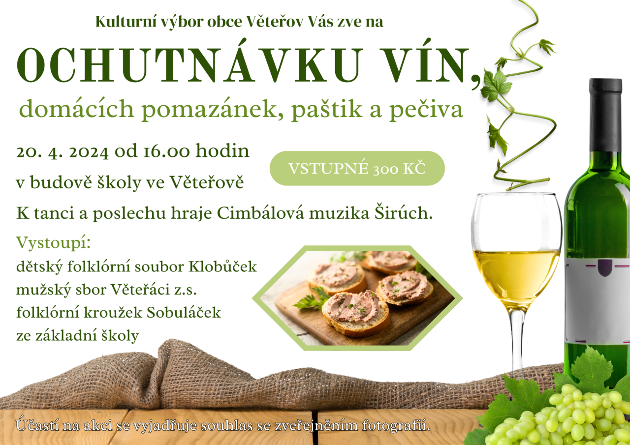 Kulturní výbor obce Věteřov vás zve na OCHUTNÁVKU VÍN, domácích pomazánek, paštik a pěčiva. Akce se uskuteční v sobotu 20. 4. 2024 od 16:00 hodin v budově školy ve Věteřově. K tanci a poslechu hraje Cimbálová muzika Širúch. Vstupné 300 Kč.