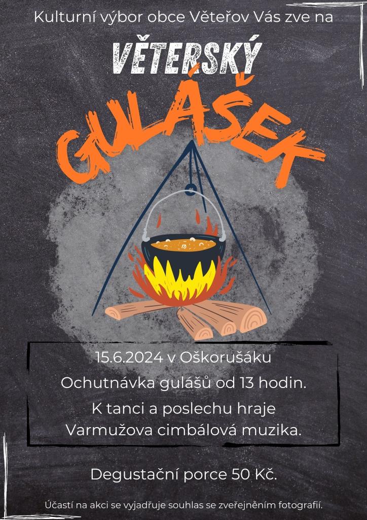 přijměte pozvání kulturního výboru obce Věteřov na první ročník Věterského gulášku, který se uskuteční v sobotu 15. června od 7 hodin v Oškerušním dole.